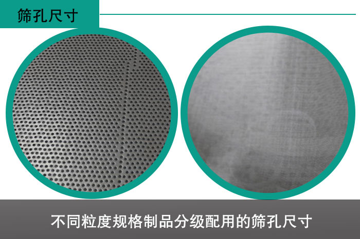 不同粒度規格制品分級配用的篩孔尺寸:分級制品粒徑(mm)為2.40、3.20、4.00、4.75、6.35、9.50、12.7和碎粒,相應配用的篩孔尺寸(mm)為1.65、2.23、2.92、3.89、5.21、8.97、11.5和1.16。可以看出,要控制某個粒徑的顆粒不通過篩孔,應采用比該粒度值小的篩孔直徑。