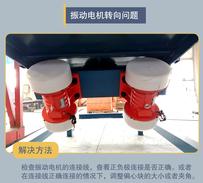 直線篩時使兩臺臥式振動電機作為振動篩,電機的轉向和分為正轉和反轉兩種,正常情況下兩臺電機的轉向是相反方向的,但如果用戶在接電時正負極接錯就會引起電機同向旋轉就會出現篩面物料不走料的問題。